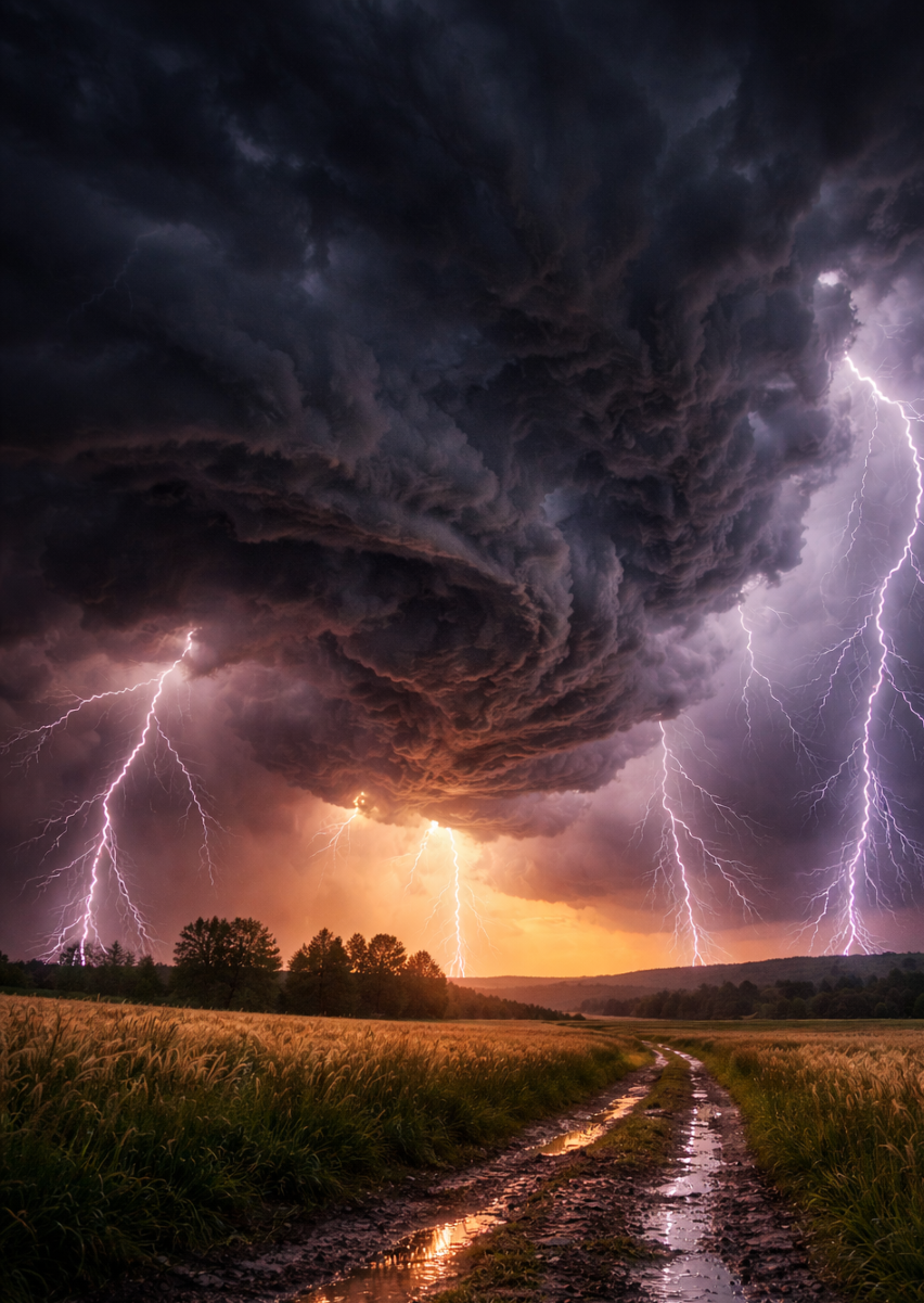 A violent supercell storm unleashes a barrage of lightning over a quiet rural path, as towering clouds churn like a living force and the horizon glows with the last breath of sunset.